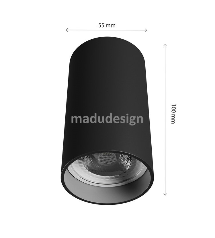 LED přisazené svítidlo s krytím IP20. Tvar tubus - válec. Barva černá a stříbrná. Hliníkové tělo. Špičkové zpracování. Určeno pro žárovky s paticí GU10, napětí 230V. Nastavitelný směr vyzařování.