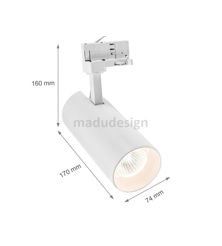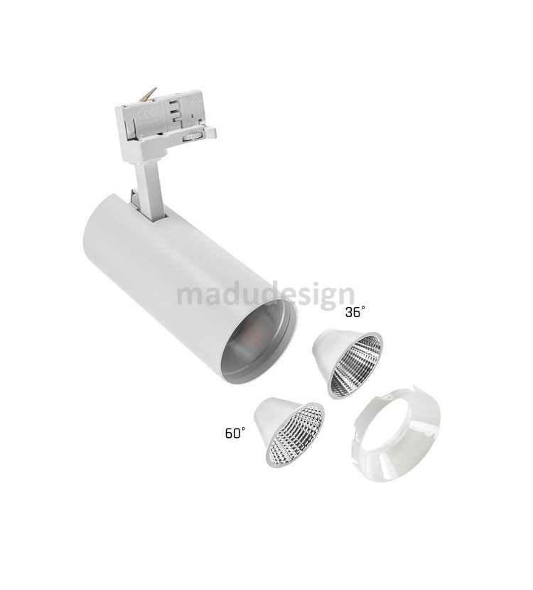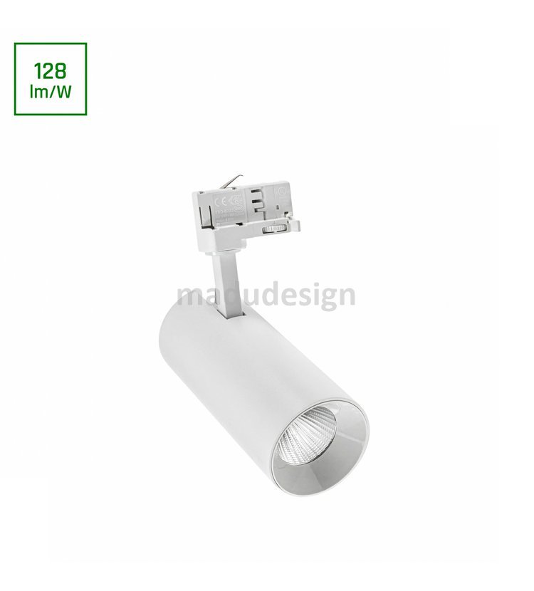 LED třífázový lištový reflektor. Výkon 25W, světelný tok 3200 lm. Teplota chromatičnosti 3000K, index podání barev Ra 80. Vyměnitelný reflektor s úhlem vyzařování 36° nebo 60°. Záruka 2 roky. Barevné provedení bílé.