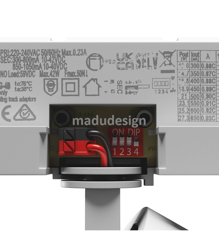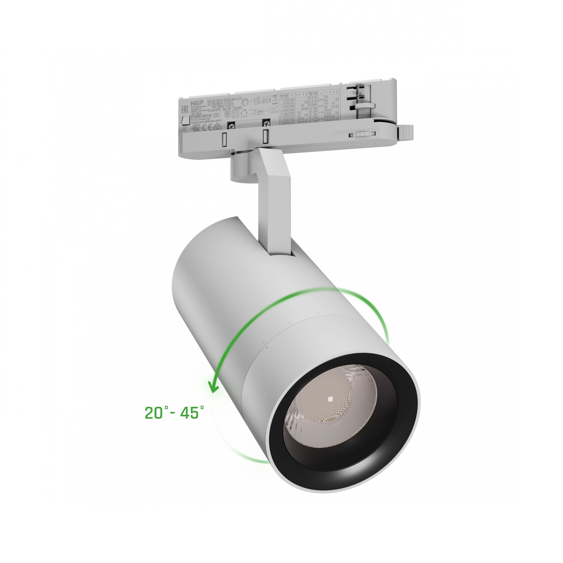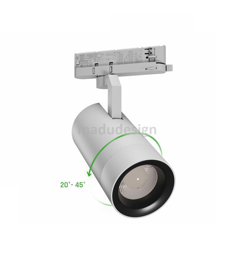 LED třífázový lištový reflektor. Nastavitelný výkon přepínačem na adaptéru 19W až 42W, světelný tok 1800 až 3200 lm. Teplota chromatičnosti 4000K, index podání barev Ra 90. Nastavitelný úhel vyzařování 20° až 45°. Špičkové provedení svítidla s dlouhou životností 50.000 hodin a zárukou 5 let. Barevné provedení bílé.