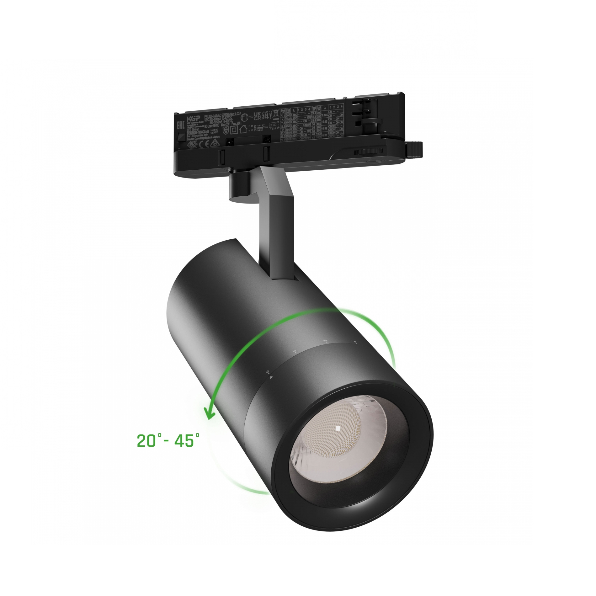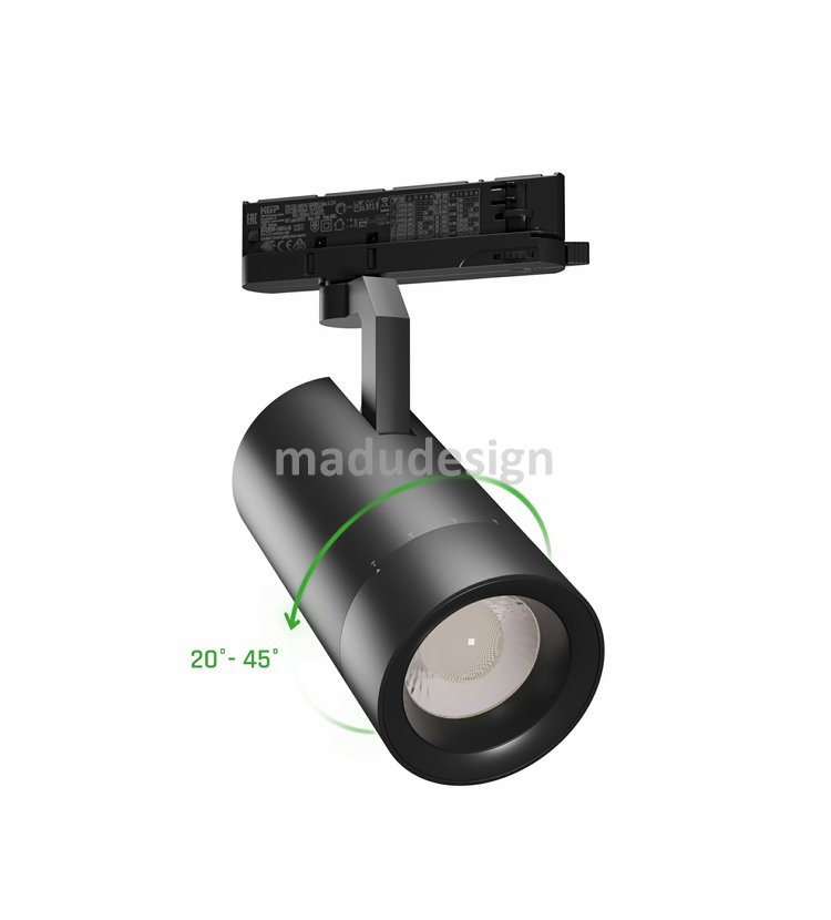 LED třífázový lištový reflektor. Nastavitelný výkon přepínačem na adaptéru 19W až 42W, světelný tok 1800 až 3200 lm. Teplota chromatičnosti 4000K, index podání barev Ra 90. Nastavitelný úhel vyzařování 20° až 45°. Špičkové provedení svítidla s dlouhou životností 50.000 hodin a zárukou 5 let. Barevné provedení černé.