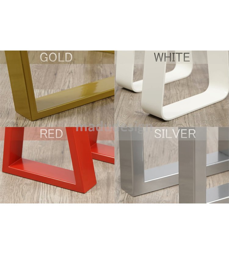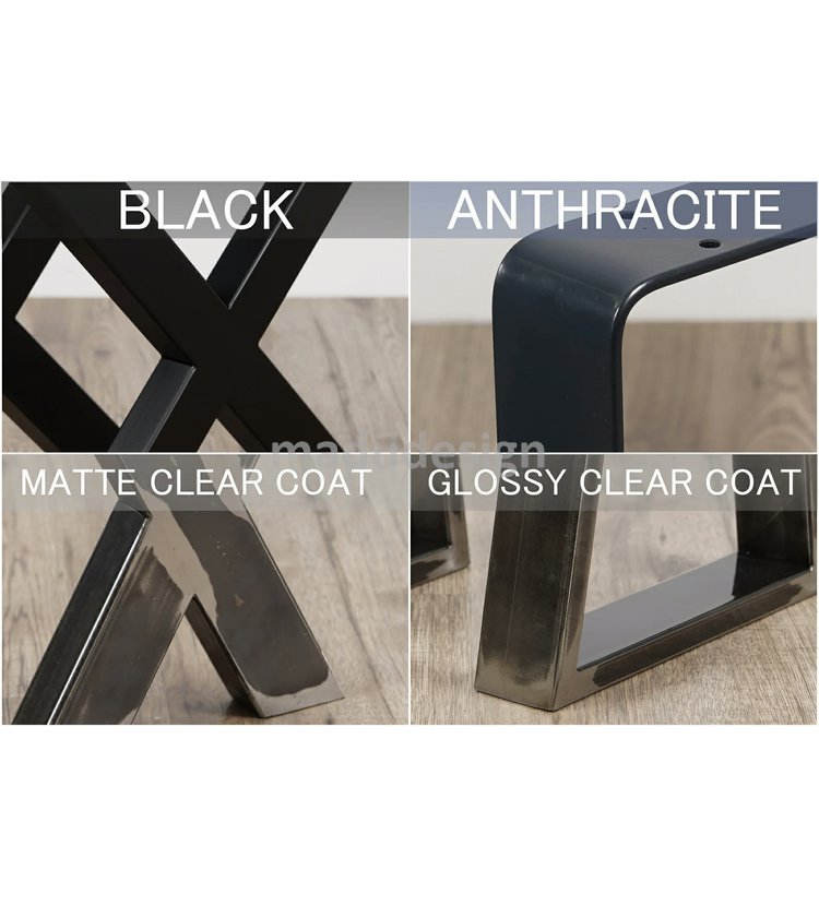 Ocelové industriální podnoží lakujeme práškovými barvami v odstínech: černá, antracit, bílá, zlatá, stříbrná, červená, hnědá, nebo v provedení surová ocel (bez úpravy), bezbarvý lak lesk, bezbarvý lak mat.